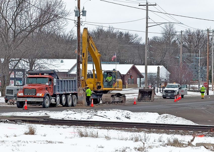 The break was very close to the railroad tracks, explained Public Works director Travis Peterson, so it couldn’t just be dug up and fixed. Instead, they added a gate valve south of the tracks as a temporary fix. The break is thus isolated, but not yet repaired. And water has been restored to the two businesses south of the tracks, Land O’Lakes and the American Legion Club.