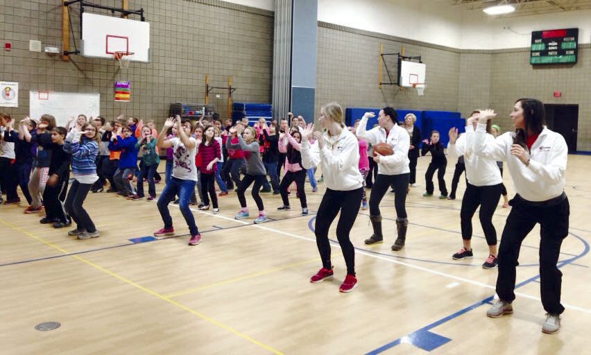 Members of the College of St. Benedict basketball team volunteered at Kimball Elementary School the morning of Thursday, Jan. 8. They helped students in classrooms with reading or math, with projects, and in phy. ed. learning basketball skills. Submitted photo.
