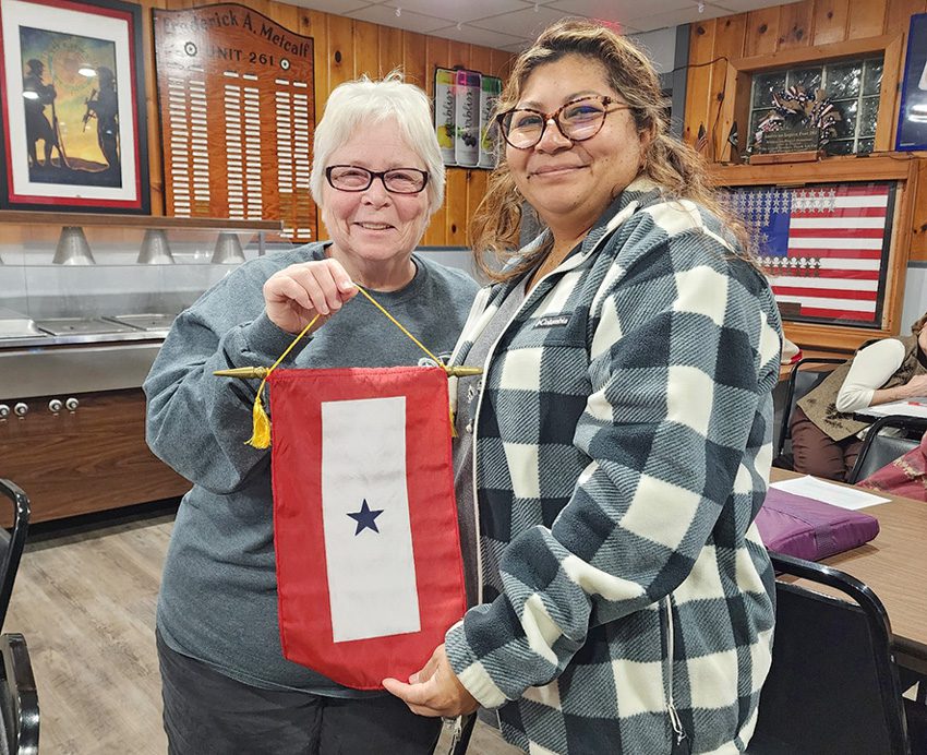 On Wednesday, Nov. 20, the Kimball American Legion, Unit 261, recognized Patricia Dirschel, an Auxiliary member of the Kimball Unit, with a Blue Star Banner. Renee Berscheid, membership chairman, presented the Blue Star Banner at their unit meeting. The Blue Star Banner is presented to a family who has a family member serving in the military. Patricia’s son Edgar A. Lopez is serving in the U.S. Army.