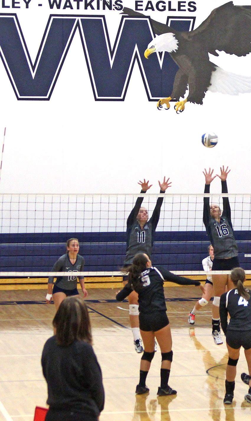 EV-W seniors Breanna Walz and Emma Schultz block against ACGC Tuesday, Aug. 28, in their first game of the season. The home game was also Parents’ Night at EV-W. Staff photo by Anton Matua.