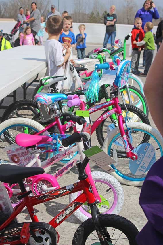 This year, the Watkins Lions purchased and gave away six bicycles, two for each age group. Registered names were drawn for a variety of age-appropriate prizes, and the bikes were saved for last. Winning the bicycles were, from left: Jase Turnbough age 2 (being held), Brynley Kramer age 1, Beth Berg age 6, Ethan Story age 4, Deuce Eder age 8, and Siena Hemmesch age 7.5. Staff photo by Jean Doran Matua.